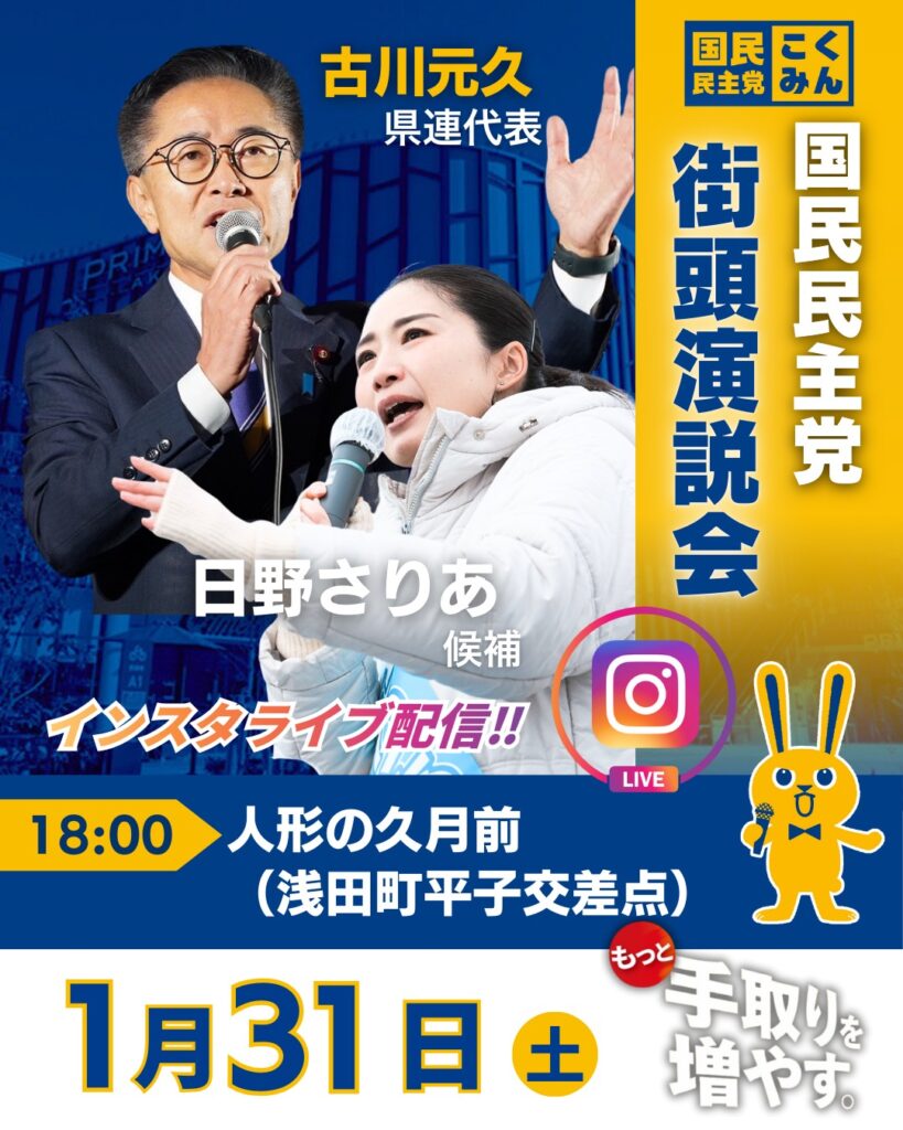 選挙戦も中盤戦に差し掛かった日曜日。 この重要な局面に、国民民主党 愛知県連代表 であり、愛知2区選出の大先輩 古川元久 代議士が、日野さりあの応援に駆けつけてくださいます!