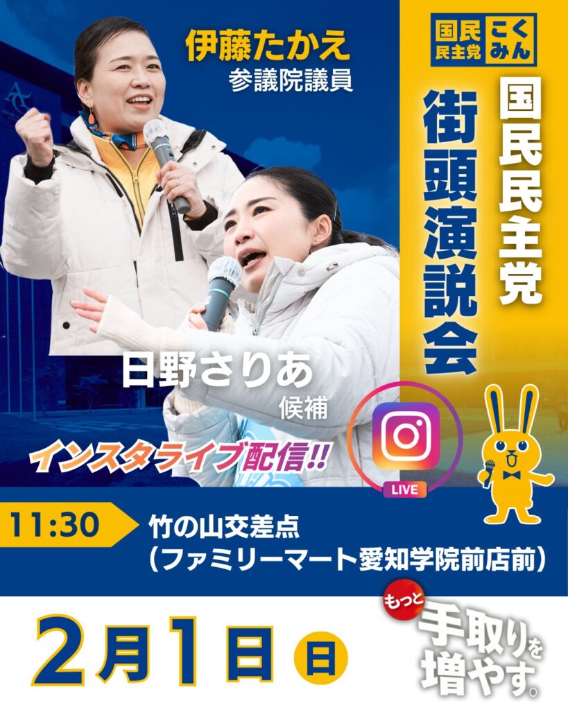 🗣 弁士 伊藤 たかえ(参議院議員・国民民主党副代表) 日野 さりあ(衆議院議員・愛知7区)